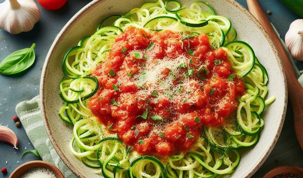 - Escurrir bien los espaguetis de calabacín y mezclarlos con la salsa, añadir un poco de albahaca fresca u orégano